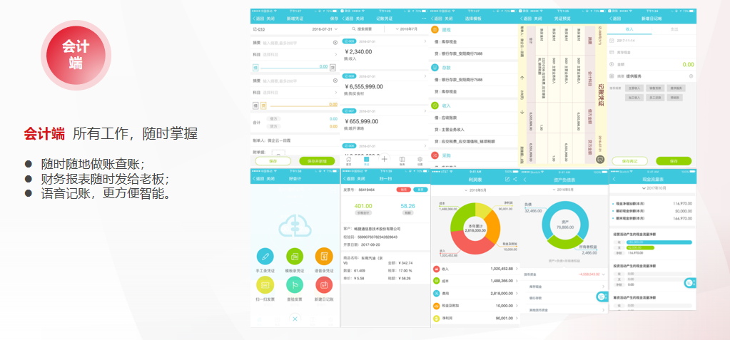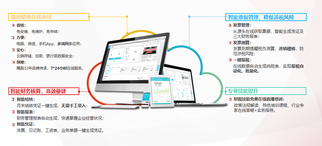 是面向小微企业的票财税费银档一体化的财务云应用, 帮助财务人员通过 PC 端、手机端、微信端随 时随地管理现金银行、发票、往来、报税、经营分析等,高效、智能提升小微企业财务管理水平。l软件免安装、自动升级、免备份、免年结